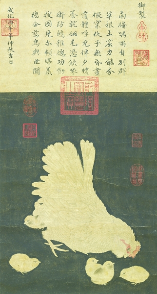 子母雞是描繪老雞與幼畜相處的繪畫題材。這種題材最早可以上溯到宋代,臺北故宮博物院便存有定為宋人所作的《子母雞圖》。這件作品在黑地上描繪一只白雞與五只幼畜相處的場景。畫家的描繪十分寫實,甚至連雞身上的羽毛也一一分明地畫出,這與《芙蓉錦雞圖》的技法如出一轍。不同的是,《子母雞圖》的畫面情節感并不強。五只小雞相互顧盼,還有的躲在母雞身后,與母雞一同構成了簡單的畫面。但是,畫家在處理此作時,運用了三角形的穩定構圖,這不僅使得畫面看上去更加安穩,更形成了此類作品的固定模式。這種模式很容易使人產生政治上君父臣子、統治穩固的聯想,而該作上方明憲宗朱見深的題詩仿佛也印證了這一點。值得注意的是,作為宣宗的孫子,憲宗也是一位擅長繪畫的皇帝。