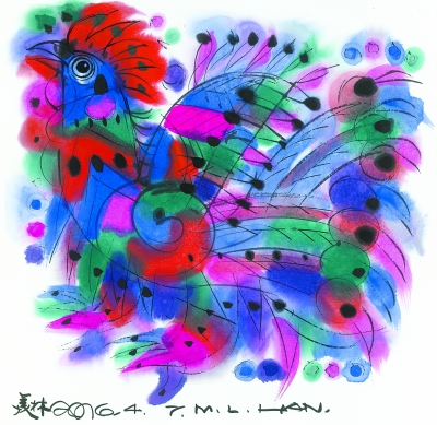 最廣為人知的雞年題材繪畫作品,當屬印在郵票上的生肖雞。雞年生肖郵票迄今已發行四輪,除1993年《癸酉年》的剪紙圖案出自河北省農民藝術家蔡蘭英之手外,其余三輪的圖案均為畫家所繪。1981年《辛酉年》雞票圖案由曾參與國徽設計的畫家張仃創作,采用裝飾畫法,描繪一只昂首報曉的雄雞,意在鼓舞人們奮發向上。2005年《乙酉年》雞票圖案由畫家呂勝中創作,采用中國畫寫意畫法,表現的是一輪紅日上方一只昂首欲鳴的彩色公雞,紅日與公雞巧妙組合成一個“酉”字,代表雞年。第四輪生肖雞票即為2017年最新發行的《丁酉年》特種郵票,全套2枚,圖案由北京奧運會吉祥物“福娃”的設計者韓美林創作,第一枚畫面上是一只威武雄壯的大公雞,第二枚畫面上是呵護幼子的雞媽媽與兩只可愛的小雞,表現了生肖雞幸福美滿的一家,既突出了雄雞起舞、大吉大利的生肖賀歲主題,又展現了和諧幸福的家庭生活,延續了2016年《丙申年》生肖猴票“合家歡”的主題。