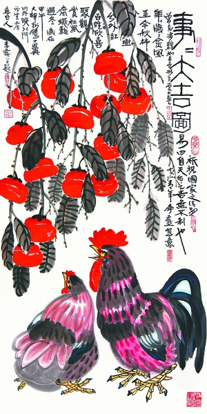 在雞畫作品大量產生的同時,畫中雞的數量也越來越多,從傳統的通常繪有一只大雞的《大吉圖》、兩只雞的《雙吉圖》、三只雞的《三吉圖》到一只大雞帶數只小雞的《五子登科圖》《教子圖》,發展到當代則出現了多幅《百雞圖》,最多的可能要算是北京奧運會前后推出的“千雞圖”了,據說畫面中共有2008只雞,真可謂熱鬧到了極點。