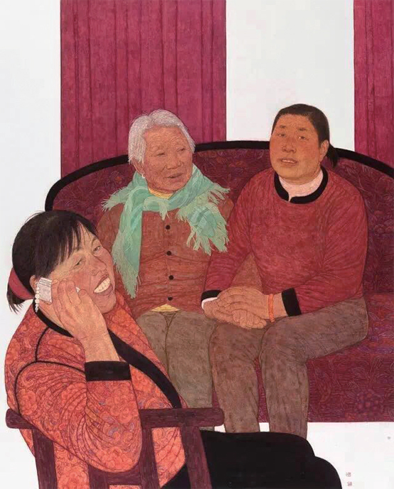 其中,給人印象深刻的當屬“向人民匯報——20位中青年美術家深扎作品展”,此展是繼2015年舉辦“當代15位美術家深扎作品展”之后,著眼于呈現當代中青年美術家深扎主題實踐的展覽。此展不僅在年齡選擇上以“70后”、“80后”畫家為主,而且出展作品都是這些畫家長期深入他們鐘情的某一生活基地而不斷積累、長期沉淀的作品。譬如,持續關注城市農民工生存狀態的李傳真,此次回到了她曾下放過的湖北三湖農場,創作了《放學》《暖陽》和《婆·媳》等工筆畫,作品著重刻畫了那些鄉親們明朗、歡愉、自足的精神面貌與生活情態。這種具有生活溫度的畫作,還使得工筆人物畫在深化寫實程度的同時,也深刻體現了從西式寫實再度向東方寫意回歸的藝術探索。作為蒙古族畫家,鮑風林在采風寫生基礎上創作的《長調草原》,從現代文明的視角發掘了游牧民族原生的文化形態,畫作通過對草原長調歌詠的表現,展現了寬廣恢弘的民族史詩,水墨基調也由此顯得蒼茫凝重。應當說,深扎主題實踐,讓許多中青年美術家找到了藝術創作與藝術創新的根脈。一方面,他們從人民深厚的生活土壤里發掘出普通人的精神境界,并在清新藝術語言的開拓中最大限度地表達了人民的思想情感;另一方面,他們從全球化視野和現代文明角度對于中國傳統文化的再發現,也在很大程度上影響了他們藝術探索的路向,從而更加堅定了他們從本土的現代境遇中探尋自主發展道路的信心。