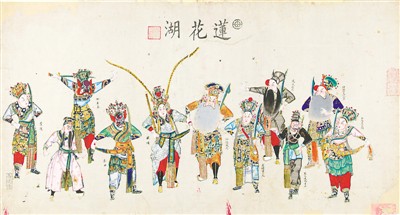 此外,還有一些作品屬于年畫畫師“點套”的粉本,即印出墨線版后,畫師直接在上面手工填色,刻工再據此分別刻出各塊色版。這類粉本過去在年畫作坊內秘而不傳,今朝得見,也是非常難得。這次展覽中的《雅觀樓》《逍遙津》《雁門摘印》《捉放曹》《年年太平》等,就屬于粉本中的精品。