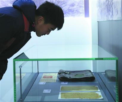 一名學生仔細觀看淞滬抗戰實物