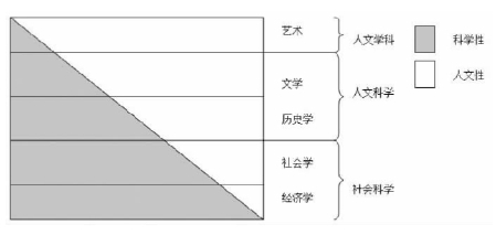 其中經濟學是一極,其理性成分最重,而人文性最弱;另一極——藝術,其人文性最強,而科學與理性成分最弱,從經濟學、社會學、歷史學、文學到藝術,理性或科學性遞減,人文性遞增。當然,嚴格地說,最富藝術性的音樂,也含有理性,瑪麗婭娜·韋伯為馬克斯·韋伯《經濟與社會》所寫的前言中曾指出,“理性也在并且恰恰在音樂——這個似乎是最純粹淵源于感情的藝術——里,起著一種至關重要的作用” 。藝術以下諸學科,皆以“學”命名,其中經濟學、社會學可以稱為社會科學,歷史學、文學可以稱為人文科學,而藝術,就不以“科學”稱之,而是人文“學科” 。比如音樂,盡管也有樂章、旋律、節奏、節拍等理性規范,但它卻是“最純粹淵源于感情的藝術” ,不能以科學名之。