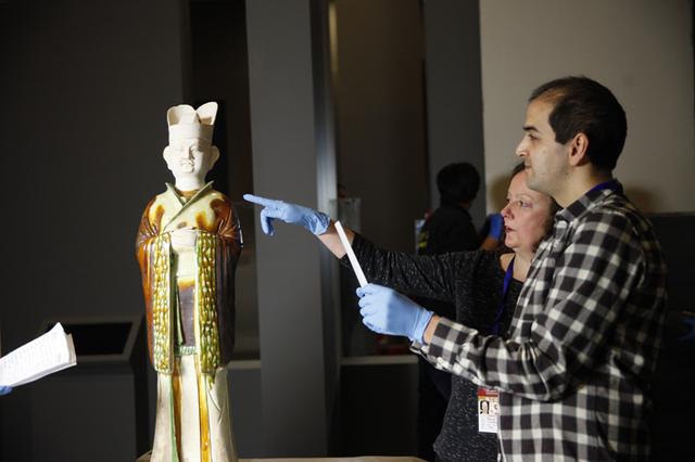 2月底,大英博物館工作人員在中國國家博物館布展三彩文官俑 拍攝:周子杰