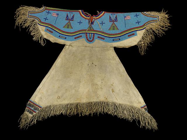 在展覽中,還有一件由加拿大梅蒂斯人(注:印第安人與白人通婚的后代)制作的長外衣。它用了原住民的傳統材料,但外形是歐式的。由于傳統材料非常脆弱,它也無法長期展出。在堪培拉的展覽結束之后,我在大英博物館庫房挑選了一件北美印第安蘇族人制作的童裝,作為它的替代品。