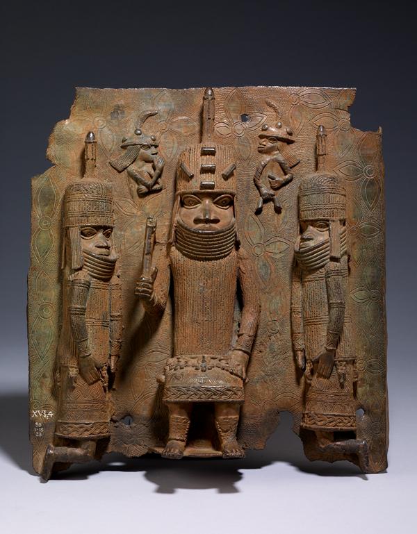 以貝寧飾板為例。許多人熟悉歐洲與非洲西部的這段貿易史,但關于它的大多數記載都來自歐洲人。而通過這些飾板,我們可以認識非洲人對這段歷史的看法——在飾板的中央,是巨大的貝寧國王奧巴像,歐洲人的像比他小了許多,這象征了貝寧國王的勢力。當然,歐洲人的記載是完全相反的,他們認為自己征服了貝寧。