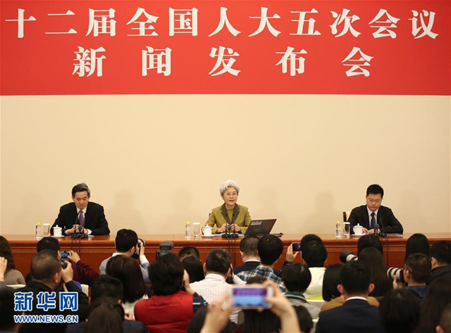 3月4日,十二屆全國人大五次會議在北京人民大會堂舉行新聞發布會。大會發言人傅瑩就大會議程和人大工作相關的問題回答中外記者的提問。新華社記者 金立旺 攝