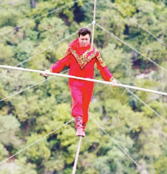 阿迪力也一直身體力行,積極弘揚少數民族地區優秀的傳統文化。他5歲時父親去世,留下遺囑說不許孩子學習達瓦孜。后來阿迪力自己練習,并加入了父親當年所在的英吉沙縣雜技團。一次演出中,主繩突然斷裂,阿迪力高空摔下造成身體17處骨折,醫生說可能永遠無法站立,那時候,阿迪力才想起父親的遺言,不讓孩子學習達瓦孜,也許是因為實在是太危險了。因為對達瓦孜的熱愛,他又重新站到了舞臺上。而更多的人知道阿迪力,大概緣于十幾年前那次他高空走繩索橫跨長江三峽。當時他在電視上看到美籍加拿大人科克倫準備橫跨三峽,挑戰世界紀錄,心里很不是滋味:“三峽是中國的三峽,中國那么多人,讓外國人打破紀錄,豈有此理! ”阿迪力決定向科克倫挑戰,他通過演出和發動群眾捐款籌措資金購買鋼絲繩, 1997年6月22日正式挑戰跨越三峽,以13分48秒的成績刷新了科克倫53分10秒的紀錄。這是他第一次打破世界紀錄,也將達瓦孜的名字傳遍中國,傳到世界。此后,阿迪力又接連打破多項世界紀錄,還曾在國家體育場“鳥巢”創造了“連續60天累計走鋼絲時間之最” ,借此弘揚達瓦孜藝術。去年“2016阿迪力高空挑戰極限之旅” ,他沿絲綢之路經濟帶,行程上萬里,為各民族文化交融搭建平臺,架起了絲綢之路友誼的橋梁。