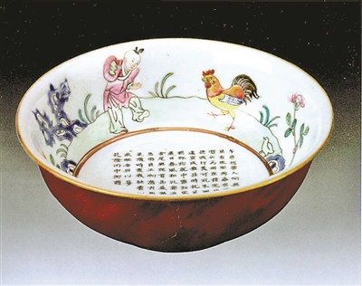 此外,一件清代初期的青花瓷罐,罐身上畫有牡丹,花叢中有兩只雉雞相互顧盼。畫法工整、傳神。牡丹以雍容富麗的花姿號稱百花之王,寓意富貴;雞與“吉”諧音,有吉祥之意。另一件延慶出土的清代粉彩斗雞碗,雄雞邁步向前,黑色尾羽翹張開來,后跟一雛雞,前面一童子作邀斗狀。紅色雞冠、黃色雞喙、黑色雞尾、藍色雞翅,都點綴得恰到好處。雖為斗雞,但毫無緊張之氣,而是其樂融融。
