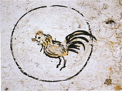 墓室西側的雞,與十二生肖中的“酉”位相對。身體輪廓的顏色為黑彩,內填黃彩,高約25厘米。寥寥數筆,但很傳神。它雙腳直立,頭前傾,尾翼展開。雄赳赳,氣昂昂,斗志昂揚,似乎拉開架勢準備大干一場。實際上,古人很早就注意到公雞的好斗習性?!稇饑摺分杏涊d,齊國都城臨淄其民無不吹竽、鼓瑟、擊筑、彈琴、斗雞、走犬。斗雞,至少在兩千多年前就已經成為人們的一種娛樂方式。