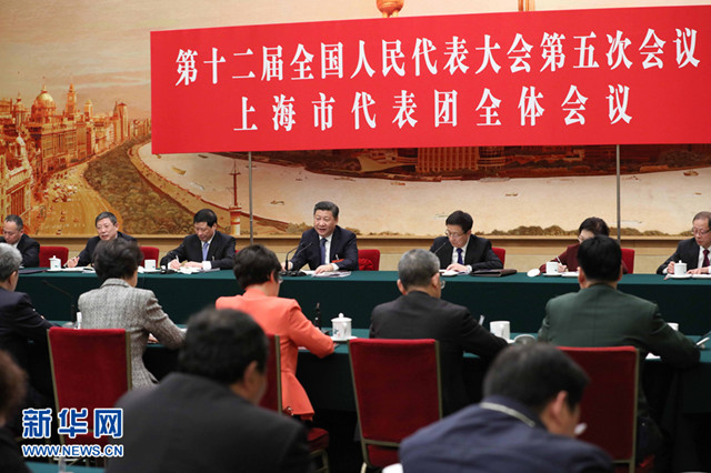 3月5日,中共中央總書記、國家主席、中央軍委主席習近平參加十二屆全國人大五次會議上海代表團的審議。