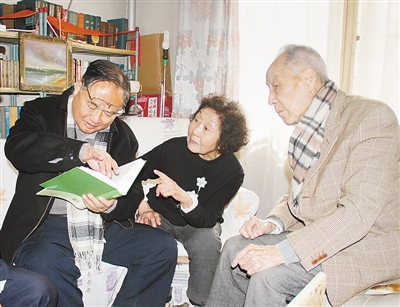 2015年3月20日,作者(左)在北京大學暢春園,與許淵沖先生(右)交流翻譯理論。(圖中為許淵沖的夫人照君)