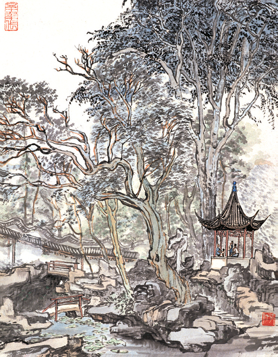 新中國成立后,舊中國畫體系面臨難以真切反映新的社會生活與時代精神的困境。如何“推陳出新”?千年的筆墨何以當隨時代?這在當時成為焦點話題。因為,它直接關系到中國畫的探索、繼承與發展。倡導以寫生方式改造中國畫的李可染得到張仃的鼎力支持,并促成了1954年李可染、張仃、羅銘三人從杭州到紹興、富春江、蘇州等地,歷時三個月的江南寫生。此次寫生,張仃以西方繪畫對景寫生的方式,突破傳統的文人畫體系,表現江南山水庭院的清新和溫情。他直接用毛筆在宣紙上現場繪制,筆法遒勁,皴擦點染并施,畫中的明暗、透視以及對于光影的運用,是過去中國畫中罕見的。這一新的繪畫觀念與實踐,盡管與徐悲鴻所提倡的中國畫改良有著相似之處,但“對景造境”的直接寫生,表現火熱的社會主義建設,在當時被視為創舉,為困境中的山水畫發展找到了新徑,具有里程碑意義。