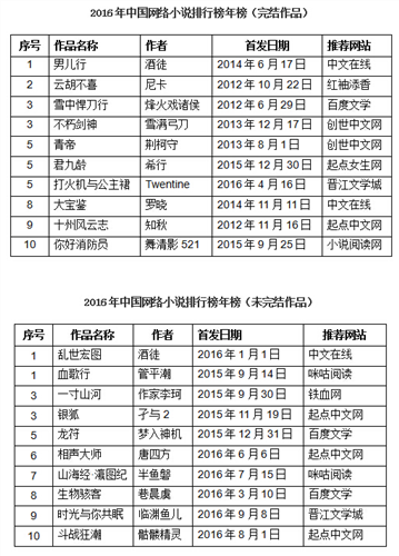 2016年中國網絡小說排行榜年榜。 中國作家網 圖