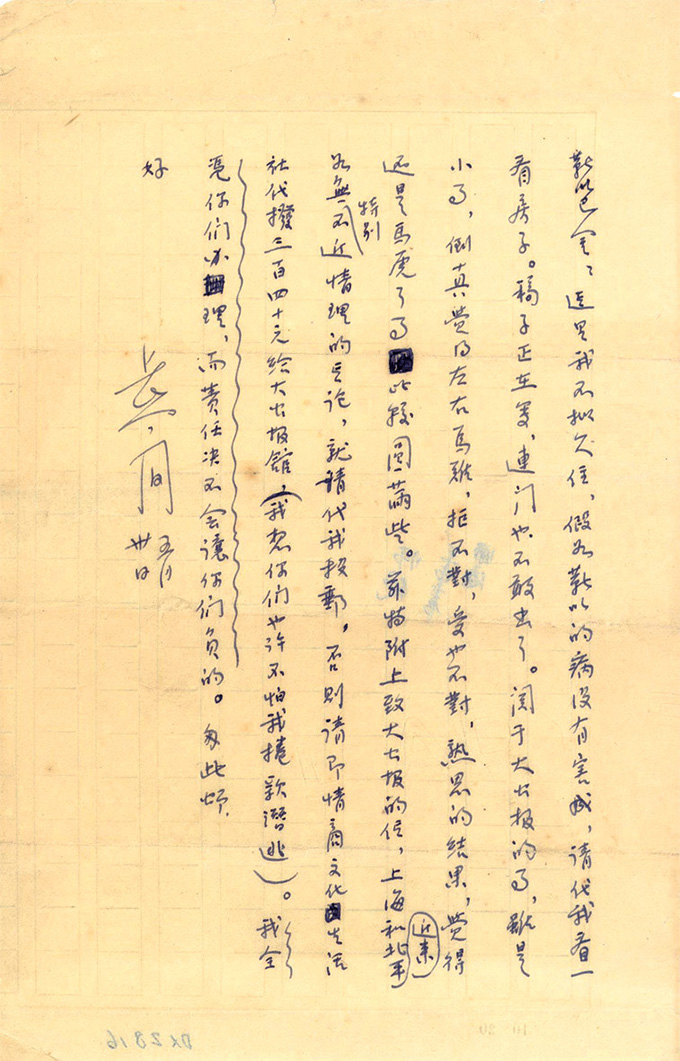在中國現代文學館館藏中,有一封師陀在1966年4月24日寫給巴金的信。師陀當時因高血壓病到華東療養院療養,住院10多天后,他特意寫了此信給巴金,在信中他建議巴金應早日加入中國共產黨: