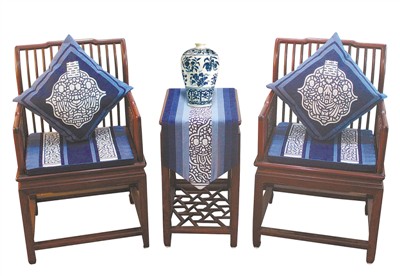 他是這么說的,更是這么做的。他把傳統的小布印染發展為寬布印染,把單調的藍白兩色創新到深淺藍復色,把原始棉麻面料拓展到絲綢面料,創作出大量兼具傳統與新意的紋樣,制成兼具實用性和審美性的衣服、桌布、抱枕等,與更多人分享藍白之美。每當他的努力得到實踐的認可,父親都會咧開嘴笑成孩子模樣。