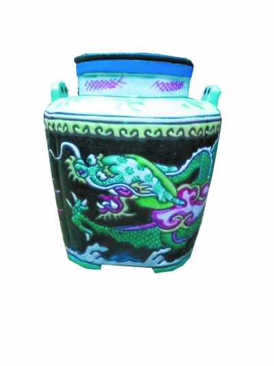 清朝時的紫砂掛釉器物更傾向于華麗。朱銀木收藏的清中期四方倭角龍紋壺,艷麗多彩,盡顯雍容華貴。壺身上的青龍栩栩如生,呼之欲出,而四爪的腳則說明這件器物在當時只有王公顯貴才可使用。這類紫砂彩釉壺不惜工時、精工細作。為了使紫砂器繪上釉彩,需進行二次燒制,甚至三次,即使到了現在也需要10天左右才能完成燒制?!斑@把壺雖然殘缺了,但我還是很喜歡,它是紫砂掛釉器物中難得的精品?!敝煦y木將這把龍紋提梁壺視若珍寶。