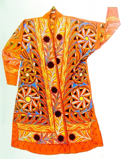 及至明清時期,西域民族紡織也有了很大的發展,棉毛麻的織造技術提高,大量綢緞、毛織物、鹿皮、牛皮、棉麻與刺繡結合,繡線選擇尚金崇艷,配色講究撞色醒目。如1963年從故宮博物院調撥,藏于新疆博物館的明代的“灑線繡云龍袍料”,其繡地為明黃緞面,繡有云紋與龍紋,龍頭上下分別繡有葫蘆、花蓋、火輪紋飾;同樣從故宮博物院調撥,藏于新疆博物館的清代的“哈薩克族鹿皮袷袢”,繡地選擇為鹿皮,鞣革細膩,在袷袢的前襟、領口、袖口處,用白、藍、紅、綠等繡線繡有花草葉組合的紋樣,色澤鮮艷;另藏有清代的“維吾爾族毛織袷袢”,繡地是羊毛織物,質地渾厚柔軟,刺繡采毛線,仍以花草莖葉紋飾為主,袷袢的領邊、袖口與前襟繡滿花紋,配色鮮艷;再有新疆博物館藏的清代哈密“維吾爾族桃紅地繡花女式袷袢”,繡地為緞,內襯為粉底花棉布,衣襟與袖口繡滿牡丹、花草樹葉紋樣;新疆博物館藏的清代“哈薩克族鹿皮繡花男褲”,繡地為鹿皮縫制,皮面上用紅、藍、白、金等各色線繡有團花紋樣、花草紋樣以及哈薩克族獨有的角形圖案;新疆博物館藏的哈密王帽,繡地采用橘黃色絲綢,帽頂與帽檐四周繡有巴旦木、石榴與花草枝葉,帽頂中心掛有瓔珞,穗帶垂及帽檐底部。清代西域也出現了大量繡地為牛皮的維吾爾族繡花高跟女鞋、繡花長筒皮靴等。