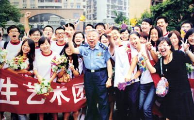 2010年,閻肅在重慶大學和大學生藝術團的同學們在一起