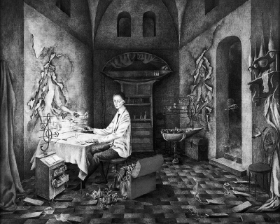巴羅是有著極高素養的女藝術家,除了繪畫,她還熱衷哲學與科學。她好鉆研、好讀書,甚至將自己的繪畫體驗用紙筆記錄下來,她表示自己看重的是每一次的繪畫過程而非結果。在她的作品中,人們不僅看到一個天馬行空、充滿想象的奇妙世界,還能看到巴羅對科學的理性理解與藝術闡釋。她的畫作對科學的領悟甚至具有前瞻性,獲得后世不少科學家的認可與稱贊。其中,《不順從的植物》描繪了一個科學家試驗種植各種奇花異草,卻在它們的瘋狂生長下無能為力,巴羅借此表達一種對科學局限性的批判,認為科學有時無法解釋所有自然現象,因此不可濫用科學,應當順從自然的和諧發展?!妒е噩F象》描繪了科學家在放滿地球儀的實驗室,模擬宇宙星球的公轉自轉,由此體驗到一種由失重狀態帶來的空間維度改變的現象。這幅畫被北美天文學家稱奇,夸贊巴羅用繪畫描繪出了這種宇宙中的失重體驗,后來這幅作品還被德國裔美籍物理學家彼得·貝格曼的《重力之謎》一書選作封面?!读骼说男求w》是巴羅對宇宙運行的擬人化描繪,她將萬物生長的中心——太陽刻畫成手持風車行走的主人,他的行走牽動了月亮及其他星球的運動,而他自己則累得滿頭大汗,這種刻畫體現了巴羅對于太陽引力約束天體的太陽系運行的深刻理解?!缎求w運行》描繪了一個形似海馬的精靈頭頂衛星狀的發射器穿梭于宇宙空間之中,它的運行似乎要靠腳下自行車的前進,又似乎要靠頭上葉片式發射器的定位,然而這種奇特的藝術構想卻是巴羅對科學熱愛的完美體現?!锻蛔凅w——地質學家的發現》刻畫了地質學家在觀察到被原子彈破壞后的地表結構所表現的驚訝與悲哀。地表干涸、土地開裂、寸草不生,一株向陽花孤零零地站立在沙土之上,喻示人類在濫用科學之后孤寂潦倒的悲慘結局。巴羅的遺作《靜物復活》再次描繪了看似被施魔法的靜物從桌面飛旋而起,如同宇宙星球在太陽引力的作用下圍繞發光體蠟燭公轉自轉一樣,這幅畫中未出現任何人物,卻暗示了一種生命自然運轉的科學道理,似乎是巴羅在告別人世之前對自己生命終結的一種預示,以及對肉體死亡、精神復活并永存人間的一種愿景。整幅畫色調明暗相間,飛轉起來的水果顆粒飽滿、鮮紅透亮,在燭光的掩映下閃閃發光,蕩起一圈圈軌道般的光波。圓桌四周暗角的地面上長出綠色的嫩芽,那是新生命的誕生。屋頂上盤旋著蜻蜓般敏捷飛舞的鳥兒,如同喚醒生命的精靈,或許也是巴羅對自己羽化升天的唯美暗示。