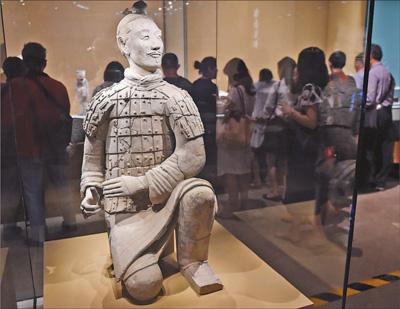 圖為18日,觀眾在首都博物館欣賞秦始皇陵兵馬俑一號坑出土的跪射俑。 新華社記者 羅曉光攝