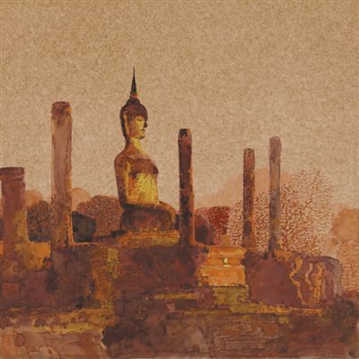 《揉進了太陽顏色的紅場》《古希臘永恒的瞬間,宛若時空的無限》《風格城市,歷史的過往》《歷史的圍墻,思想的柱樁》《曾經神的宮殿,佛的寺院,人的天堂》……展廳里,每件作品的標題都充盈著哲思,與畫面的意境相合,折射出畫家在行走和創作過程中的所思所感以及所致力的方向。