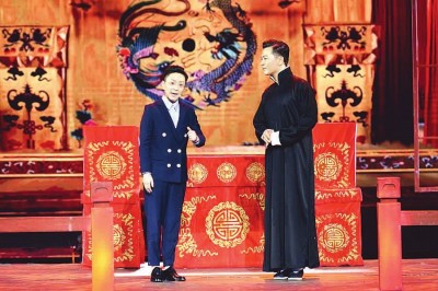 在上周六播出的電視綜藝節目《跨界歌王》中,作為評論員的王珮瑜(左)不忘普及京劇,與演員于毅互動演唱一段《貴妃醉酒》。(資料照片)