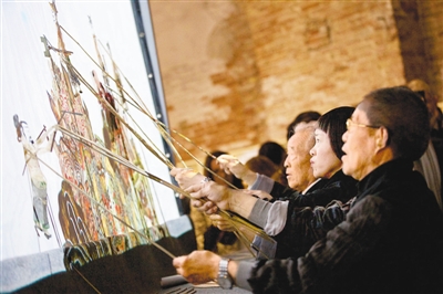 第57屆威尼斯國際藝術雙年展中國館,藝術家在表演皮影戲。 新華社記者 金 宇攝