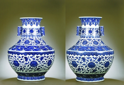 翰海春拍推出的“清乾隆青花纏枝花卉貫耳尊(二件)”是仿古佳作。貫耳尊取形自商周尊彝,多見六方式,古樸典雅。此件器物不同于一般圓器可拉坯成型,必須分塊連接,制作工藝殊為復雜。其造型、尺寸及紋飾皆與南京博物院藏品相近。其體型碩大,內壁施白釉,外部青花紋飾為多層主輔式構圖,共有十層之多,由口部至底部依次為海浪紋、花葉紋、纏枝番蓮紋、如意云頭紋、纏枝番蓮紋、海水江崖紋、如意云頭紋、主題纏枝蓮紋、海浪紋、蓮瓣紋。畫工繁縟精美,青花線條清晰,層次豐富,釉面平整光潔,玻璃質感極強。觀其青花發色,濃艷而不炫目,用點青法上色,系仿永宣蘇麻離青結晶斑之效,故紋飾有深淺之別,濃淡相宜。此器內足較淺,底書“大清乾隆年制”六字三行青花篆書款。