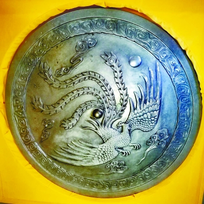 第二件是一面鏡面直徑達790毫米的唐代丹鳳朝陽紋青銅圓鏡。銹色斑斑的銅鏡背景的紋飾,分成兩個裝飾區域:主體裝飾區里,高浮雕塑造了一只展翅飛翔在云叢里的巨大鳳鳥,朝著遠方升起的一輪朝陽有力地追逐著。四條高高飄揚的羽翼整體呈現出浮動的S狀造型,與鳳鳥的側身扭動的姿態,形成了強有力的三維空間舞動的視覺效果。輔助裝飾區的鏡面邊飾,是環繞一圈的云氣紋。與戰漢時期的抽象幾何形云氣紋所不同的是,這面唐鏡的云氣紋設計,刻意表現出手動繪制的靈動生氣。該銅鏡形體巨大、紋飾生動、線條有力、細節傳神、工藝精湛,銅鏡背面整體圖案紋飾,洋溢著朝氣勃勃的旺盛活力。據榮振輝先生介紹,這面特大號銅鏡的鏡面直徑,是全世界存世銅鏡里最大的。