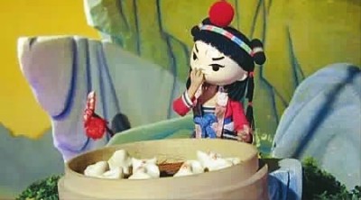 1958年出品的 《豬八戒吃西瓜》,則為中國動畫增添了剪紙動畫這么一個新品種,將中國最普及的民間傳統裝飾藝術之一剪紙運用到了動畫作品中。人物造型依靠平面雕鏤,動作吸取皮影戲裝配關節以操縱人物動作的經驗,環境空間則由繪制的紙片及貼在玻璃上的前后景構成,拍攝這樣的剪紙動畫,需要將紙偶平放在玻璃板上逐格拍攝。第二部剪紙動畫———1959年出品的 《漁童》,已經嘗試著將剪紙這一形式釀成獨特的藝術風格,只見片中作為神話人物的主人公漁童,呈現出了舞蹈化的肢體動作,頗具裝飾化的美感。到了1981年出品的 《猴子撈月》,這部剪紙動畫已經一反傳統剪紙刀刻剪鉸明快犀利的造型風格,而是純熟地從多種民間美術中汲取營養,比如,它深得皮影的精髓,也采用中國獨有的水墨拉毛工藝,利用某些紙張在濕潤情況下撕裂時所產生的纖維長短不一的邊緣效果,使裂開的邊緣看上去毛茸茸的,恰似動物的皮毛。