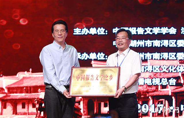 中國報告文學學會授予南潯“中國報告文學之鄉”稱號,中國作協副主席何建明為其授牌,中共湖州市南潯區委書記夏堅定上臺接牌 攝影:王紀國