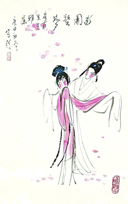馬得的戲畫,善于把漫畫的夸張變形手法與中國畫水墨寫意的筆墨情趣巧妙地融合,獨具風貌,自成一派,不求形似,只求神韻。他畫《牡丹亭》中的人物,擅用單線勾成,線如游絲,迎風飄逸,稍敷淡色,略染腮紅,如入夢境,情意萬千。他畫的《游園·驚夢》《拾畫·叫畫》以及《蝴蝶夢》等,都是夢意濃重,因此被稱為“畫夢的人”。