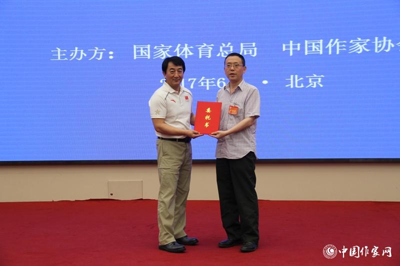 國家體育總局群眾體育司司長劉國永向作家關仁山(顧超代表)遞交創作委托書 中國作家網 超俠 攝