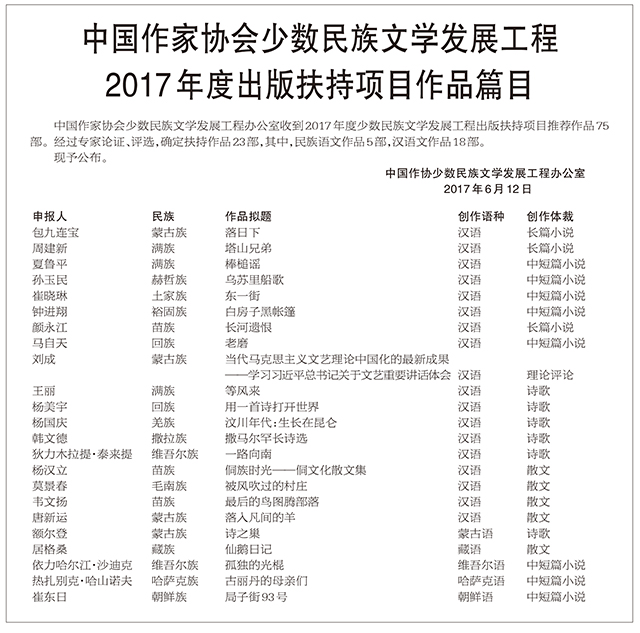 中國作家協會少數民族文學發展工程辦公室收到2017年度少數民族文學發展工程出版扶持項目推薦作品75部。經過專家論證、評選,確定扶持作品23部,其中,民族語文作品5部,漢語文作品18部。