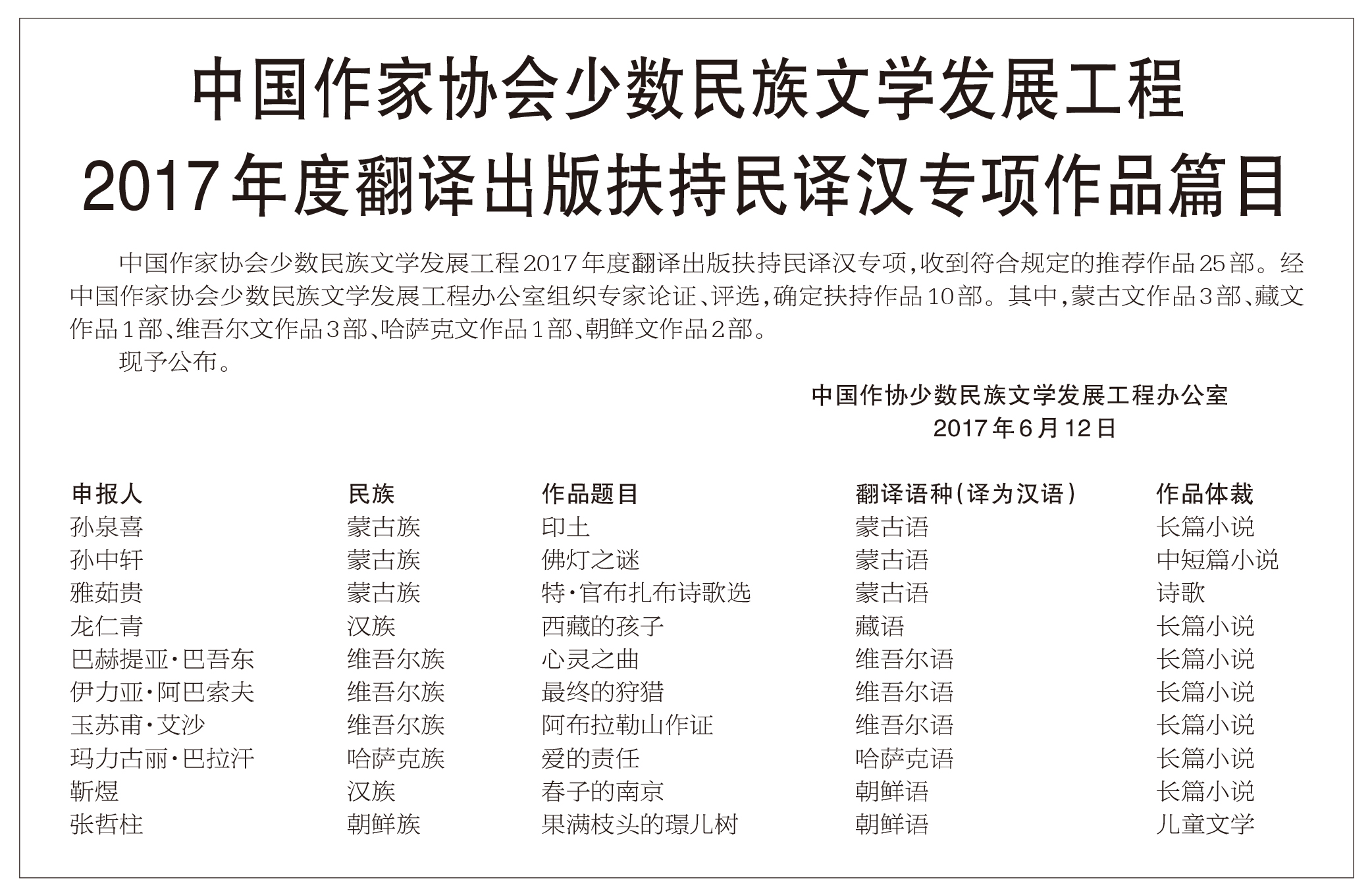 中國作家協會少數民族文學發展工程2017年度翻譯出版扶持民譯漢專項,收到符合規定的推薦作品25部。經中國作家協會少數民族文學發展工程辦公室組織專家論證、評選,確定扶持作品10部。其中,蒙古文作品3部、藏文作品1部、維吾爾文作品3部、哈薩克文作品1部、朝鮮文作品2部。