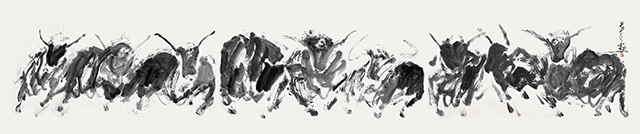 磅礴的生命力展現?!肮P性墨情,皆以其人之性情為本?!保▌⑽踺d《藝概》)真正的藝術,是創作主體的人格寫照與生命展示。唐雙寧的狂草畫,具有強烈的抒情特征,以狂放的筆墨、不羈的造型,宣泄內在的生命感受。所謂“作畫須有解衣盤礴,旁若無人,然后化機在手,元氣狼藉”(清惲壽平)。唐雙寧的狂草畫創作多遂性而作,快意抒懷,若吐塊壘。興之所至,板刷、抹布乃至雞毛撣、拖把都被他用作寫意抒情的工具。他“筆”下的代表作《萬馬奔騰》巨幅系列長達數十米,如狂飆,如巨浪,如激箭,如纛陣,如洪流,如奔云,滿紙氤氳,滿耳嘶鳴,抒發的是充沛的生命力量、蓬勃的創作激情與深刻的人生感悟,給人以強烈的視覺沖擊與審美震撼。