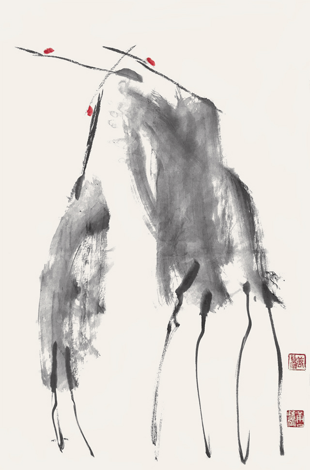 唐雙寧以狂草創作在當代書壇獨樹一幟,狂草,是他獨具的造型語言,他自創的“飛狂草書”,將飛白引入狂草,中、側、散鋒并用,橫無行、縱無列,被譽為“有里程碑意義”(楊仁凱)?!皶廉嫗楦叨?,畫至書為極則”(李苦禪),狂草的深厚造詣,使唐雙寧繪畫創作站在很高的起點之上 ,較快地找到了自己的藝術定位與創作范式,又借鑒畫家老甲的藝術風格,形成獨具特色的造型語言。他的創作,把狂草精神引入繪畫實踐,運用中國氣韻、骨法的點、線、飛白、渲染去布局造型,以狂草的氣勢、力量、變形、狂放寫意抒情,體現了藝術的變革精神、開拓意義與創新特色。