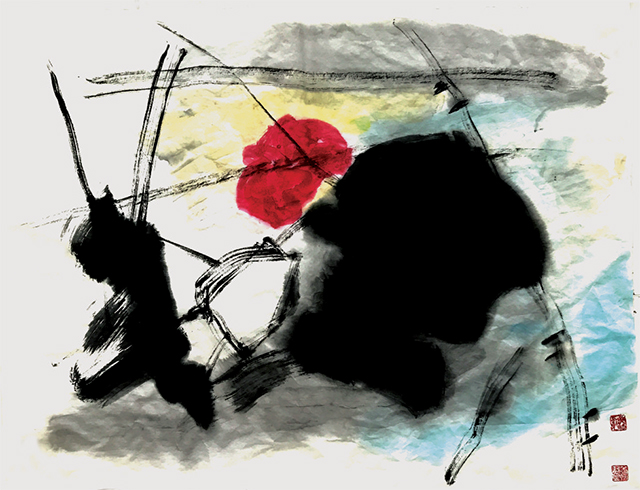 而在近年來狂草畫的創作中,唐雙寧終于完全掙脫文字中介,以狂草筆墨進行現代繪畫創作,跨入全新的藝術空間。在由書入畫的驚險一躍中,唐雙寧艱難蝶變,穿越書畫兩藝,縱身大化境界,漸入創作佳境。
