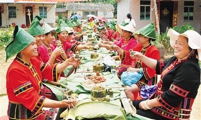 近年來,在保亭黎族苗族自治縣毛感鄉,借助每年的節慶活動日,各村男女老少,穿著民族服裝,在一片開闊的稻田地里鋪開長桌宴,招待八方來客。