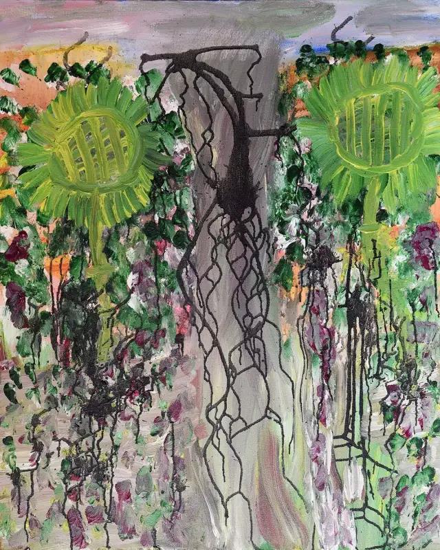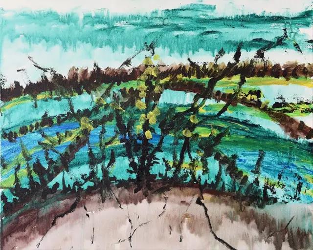 比如《繁花》,置于畫面遠景的山野和置近景的河流,和置于中景的“繁花”有平分秋色之嫌,構圖上稍顯局促。另一幅《凋零》,濃烈的色彩互相交織,凌亂的線條堆積于畫面中部,和“凋零”的主題略有背離感?!痘ㄎ戳饲椤分?,擁擠的花朵占據了畫面的全部,難免會讓視覺有太“滿”之感。