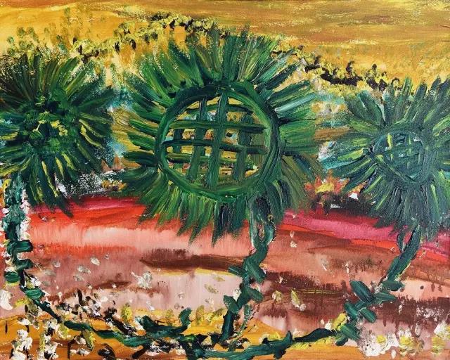 所以,海男的繪畫作品中出現的風景,既彌漫著云南高原的魔幻色彩,也隱隱可見大師的風范。她筆下的向日葵,是《白銀色的向日葵》,碩大的花朵占據了畫布的三分之二,突出和放大了觀者的視覺效果。她的另一幅布面油畫作品《水波中的葵花》,更是充滿魔幻色彩的產物,光影之間可以感受到印象派畫風對她的潛在影響。她著重于描繪自然的瞬間景象,并使之成為經典的瞬間。她將焦點轉移到純粹的視覺感受形式上,作品的內容和主題變得不再重要。