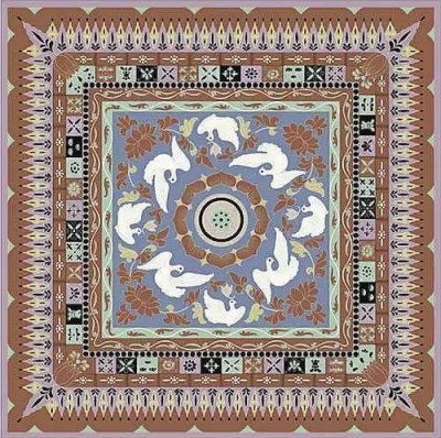常沙娜為亞太和平會議設計的彩印頭巾禮品,巧妙地運用了敦煌壁畫中的藻井及鴿子圖案。(均資料圖片)