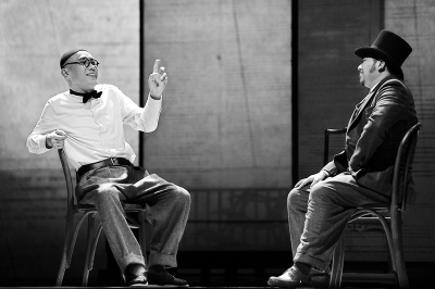 舞臺采用節奏明快的碎片化的表演形式,以英文報紙為一個時光載體,把歷史和今天、講述和新聞、風情和世相通過報紙閱讀的銜接精妙轉換。同時,《二馬》也從服裝造型上打造出了兼具英倫時尚與“京味兒”互文的造型。開放性的結尾尤其干凈大氣意猶未盡,深藏當代人精神世界的迷惘哲思。似乎這一切舞臺元素都被老舍語言預設了,大而化之若有若無,好似昨天的英倫今天的北京,并無穿越并無隔閡……