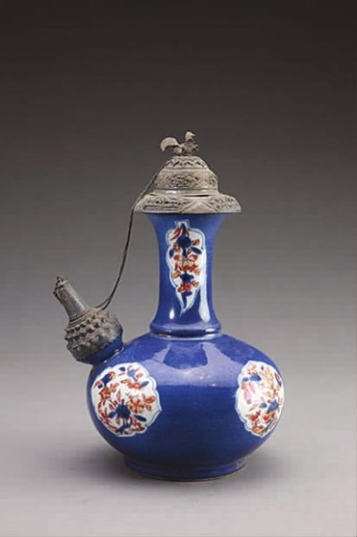 故宮藏藍地開光折枝花紋軍持?!败姵帧北緸橛《确鸾掏斤嬎?、凈手或飯后漱口使用的器皿,漢代以來隨佛教傳入中國。日后它逐漸變成一般的生活器具,多銷往東南亞地區。為了防止器物口、流的殘缺和使用的方便,這類瓷器往往進行了一些裝飾性加工,在其口、流或執柄等處鑲嵌上鏨刻花紋的金、銀、銅制裝飾,有的則在壺的口部加裝金屬蓋子,并在蓋與執柄之間連接金屬鏈條,防止壺蓋掉落,實用與美觀相結合,具有異域風情。