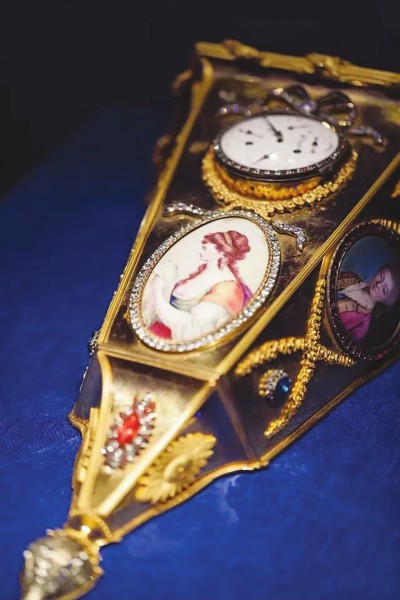故宮藏18世紀西洋銅鍍金美人圖花插式掛表。西洋鐘表曾作為西方傳教士的禮物,敲開中國宮廷的大門。明代萬歷時期,利瑪竇就曾贈送兩座自鳴鐘給萬歷皇帝,得到贊賞連連。自此以后西洋鐘表逐漸進入宮廷,其中以英國、法國制造為主。這些鐘表利用機械學、動力學原理巧妙設計,以水法、轉花、西洋人物等機械轉動配以計時,既精美又華麗,具有典型的西方裝飾藝術風格,更具有陳設效果。乾隆皇帝尤其喜愛西洋鐘表,更要求清宮造辦處制作精美的御用時鐘。
