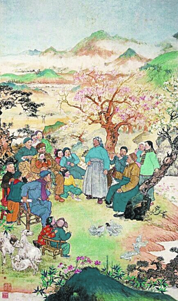 除了寫實水墨人物畫在歌頌新時代中發揮重要的作用,工筆畫也呈現出新的發展面貌。傳統的工筆人物畫家面臨著如何將傳統技法與時代內容有機結合的問題,徐燕孫、潘絜茲、吳光宇、陳緣督、白雪石、陳少梅、任率英、王叔暉、陸鴻年、程十發、劉旦宅、陸儼少、錢松喦等均有突出的表現,他們一方面繼續自己所擅長的傳統題材人物畫創作,同時賦予傳統題材積極的現實意義。另一方面,傳統人物畫家積極投入現實生活的懷抱,創作反映新人新貌的新人物畫。新工筆畫以其通俗易懂的形式和濃郁的時代氣息,為人民大眾所喜聞樂見。