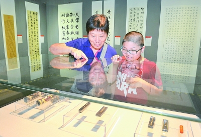 家規家訓書法展上,祖孫一起觀看廉政楹聯。鄭帥攝 光明圖片/視覺中國