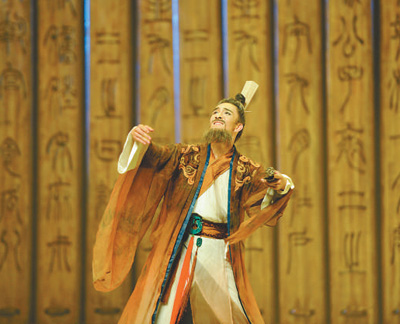 伴著悠揚的古典音樂,巨大的“竹簡”從天垂下,一席素衣的孔子緩緩走到舞臺中央,或翻滾、或跳躍,或喜、或悲,或形單影只起舞、或慷慨激昂群舞,孔子生命中的一幕幕次第延展開來……