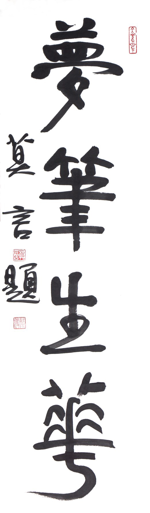 此次展覽中莫言、李敬澤、歐陽江河、張大春、馮唐、楊葵、鄭培凱、崔曼莉、徐則臣幾位作家均有書法作品展出,風格各異。張大春學書以歐陽詢開竅,其《行書自作登樓歌卷》瀟灑自得,結字疏密勻停,爭讓得體,從其作品可見涵養和學問的深厚。鄭培凱喜讀帖,作品《我為你寫詩》和《臨江仙》結字平正安穩,氣韻流暢,可見其對漢字結構和線條變化的深刻研究,頗有王羲之行書風范。莫言的《夢筆生花》,藏鋒運筆,結字端莊,渾樸沉著;歐陽江河《以夢為馬》的篆體纖細古拙,起筆宿墨與結尾飛白形成奇趣的藝術效果;李敬澤的隸書典雅樸厚,另有春秋。
